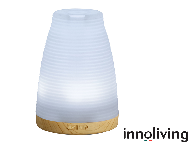 Silenzioso. Stand-by diffusione continua o intervalli. Luce fissa con cromia selezionabile. Tasto comando. Arresto automatico a fine H²O. Contenitore da 100ml.