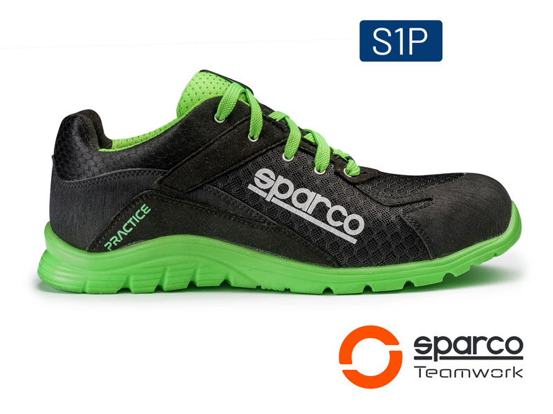 Scarpa Antinfortunistica S1P SRC della Linea PRACTICE, colore Nero-Verde. Ultraleggera stile Running in mesh 3D e microfibra antigraffio