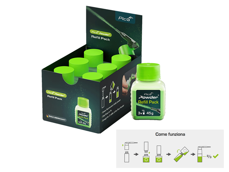 Ricarica da 45g per marcatore Powder. Cun un flacone si fanno almeno 3 ricariche. Gesso verde fluorescente, facile da rimuovere dalle superfici. Lavabile.