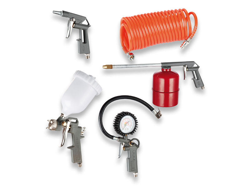 Kit accessori Hyundai per compressori: 7 pezzi con pistole, tubo spiralato e raccordi. Compatto, pratico e versatile per gonfiaggio, verniciatura e soffiaggio