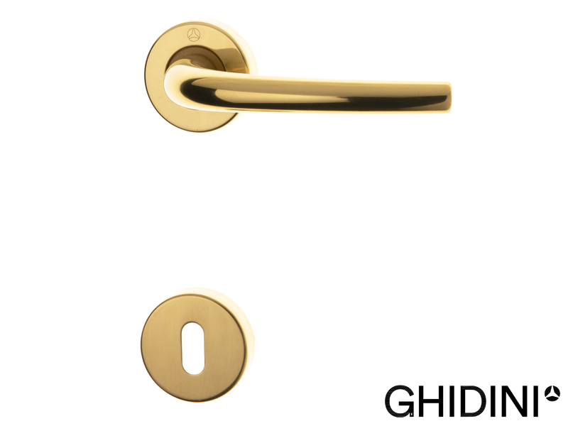 per porte interne, prodotte in lega di zama, Q8 con rosetta e bocchetta Patent. Finitura Ghicotec ottonato lucido