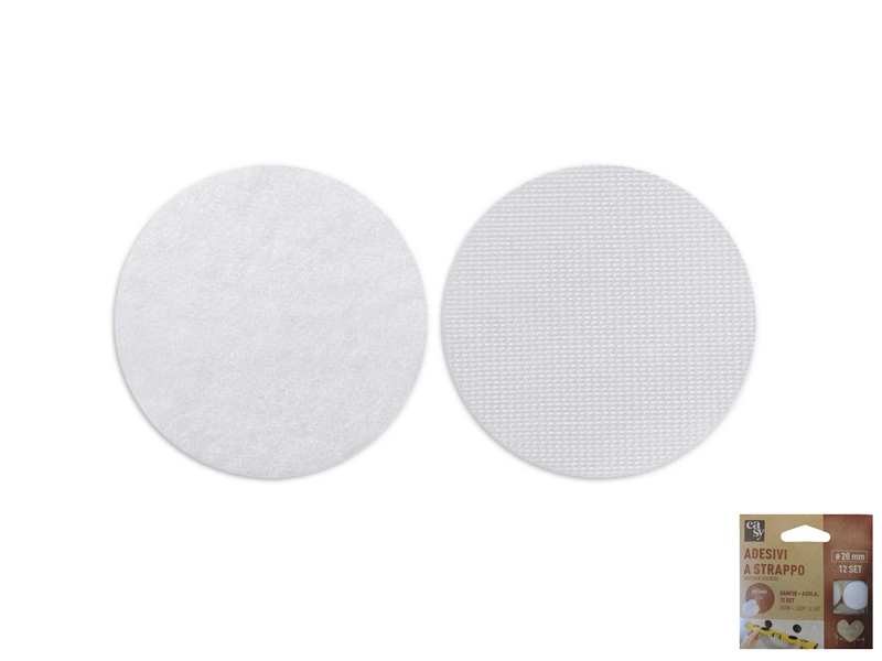 Blister con 12 fissaggi velcro bianchi tondi da 20mm maschio + femmina. Versione adesiva. Per usi generici