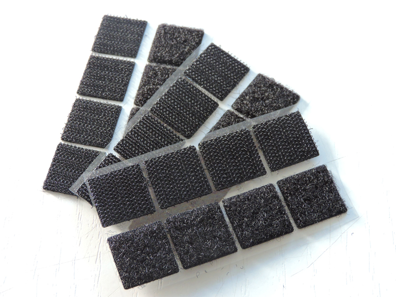 Blister con 12 fissaggi velcro neri quadrati da 20x20mm maschio + femmina. Versione adesiva. Per usi generici