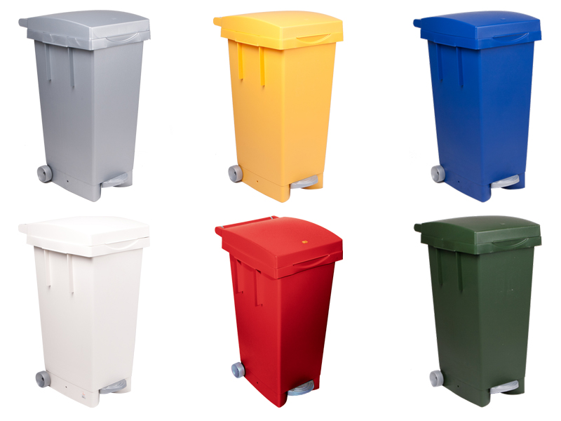 Con ruote e pedale. Capacità 80 lt. Dimensioni L x P x H: 35 x 42 x 78cm.