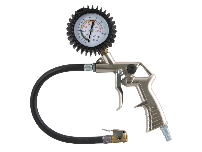 Omologata CEE. Corpo in alluminio nichelato. Manometro diametro 60mm. doppia scala 0-10 bar 0-174 psi. Con pulsante di scarico pressione. Testina di gonfiaggio 25/W. Lunghezza tubo gomma 400 mm