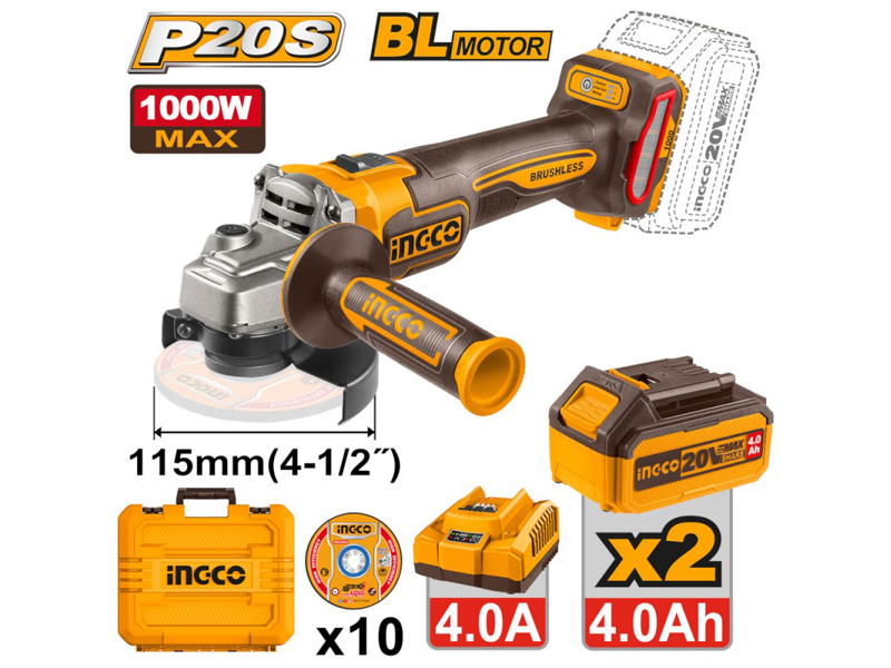 Motore Brushless, indicatore dello stato della batteria. Disco 115mm. Completo di borsa in tela, 2 batterie 20V 4,0Ah, caricabatterie e 10 dischi.