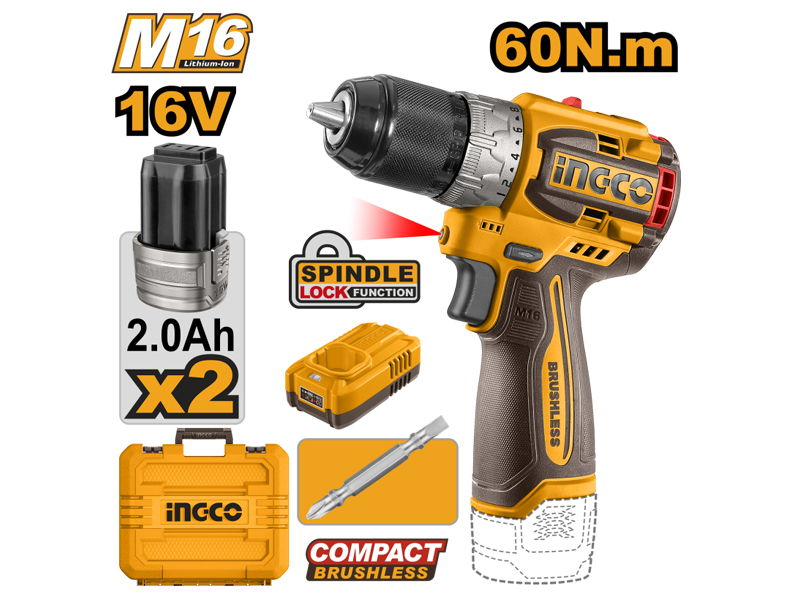 brushless, coppia 60Nm, 2 batterie al litio da 2.0Ah, caricabatterie rapido, luce LED, mandrino autoserrante in metallo 10mm, ideale per forare e avvitare con potenza e precisione.
