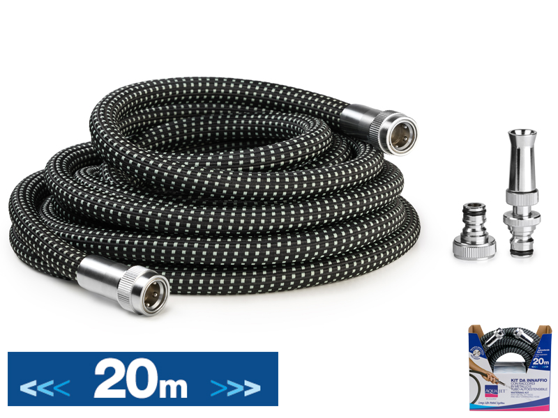 Super leggero e compatto, si estende da 10 a 20m con la sola pressione dell'acqua. Tessuto elastico in poliestere ada alta resistenza. Interno atossico. Con raccordi ottone cromato a sfere e lancia in ottone cromato.